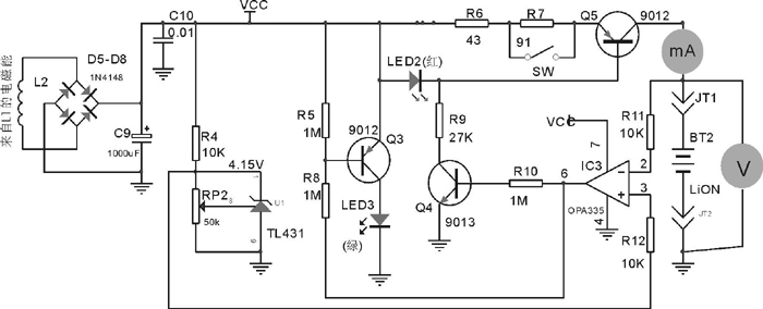 由R4,RP2和TL431構成精密參考電壓4.15V(鋰離子電池的充電終止電壓)經R12接到運放IC的同相輸入端3。當IC2的反相輸入端2低於4.15V時(充電過程中),IC3輸出的高電位一方麵使Q4飽和從而在LED2兩端得到約2V的穩定電壓(LED的正向導通具有穩壓特性),Q5與R6、R7便據此構成恒流電路I0=2-0.7R6+R7。另一方麵R5使Q3截止,LED3不亮。