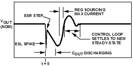 在穩壓器的電流源被控製環路調整到新值之前的時間間隔內,ESR兩側的分壓降低了輸出電壓(這段時間內COUT放電電荷量也會相應有所減少)。