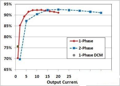 采用這種方案,轉換器效率比連續電流模式(CCM)高5%。此外,輕負載時關斷一相可以進一步提高整個應用負載範圍的效率。