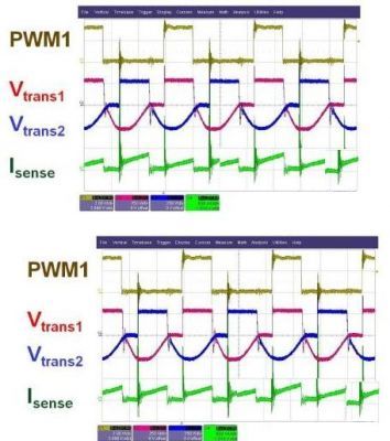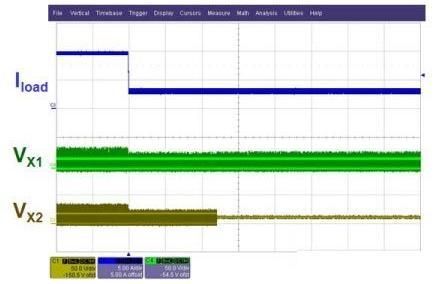 圖4. 兩相均流控製的效果:(上圖)啟用均流控製;(下圖)禁用均流控製。