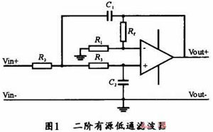 有源濾波器的設計原理圖如圖1所示,圖中采用了一個運算放大器、四個電阻和兩個電容來構成有適當阻尼的二階有源低通濾波器。