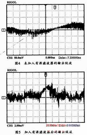 在有輸出紋波的波形中,圖4給出了未使用有源濾波網絡的輸出電壓紋波圖,而圖5所示則是使用有源濾波網絡後的輸出電壓紋波圖。