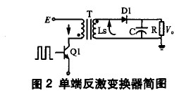 功率轉換部分采用單端反激電路,結構如圖2。當加到原邊主功率開關管Q1的激勵脈衝為高電平使Q1導通時,直流輸入電壓加在原邊繞組兩端,由於此時副邊繞組相位是上負下正,整流管D1反向偏置截止,原邊電感儲存能量;當激勵脈衝為低電平使Q1截(jie)止(zhi)時(shi),原(yuan)邊(bian)繞(rao)組(zu)兩(liang)端(duan)電(dian)壓(ya)極(ji)性(xing)反(fan)向(xiang),副(fu)邊(bian)繞(rao)組(zu)相(xiang)位(wei)變(bian)為(wei)上(shang)正(zheng)下(xia)負(fu),整(zheng)流(liu)管(guan)正(zheng)向(xiang)偏(pian)置(zhi)導(dao)通(tong),變(bian)壓(ya)器(qi)儲(chu)存(cun)的(de)能(neng)量(liang)向(xiang)副(fu)邊(bian)釋(shi)放(fang)。在(zai)此(ci)開(kai)關(guan)過(guo)程(cheng)中(zhong),高(gao)頻(pin)變(bian)壓(ya)器(qi)既(ji)起(qi)變(bian)壓(ya)隔(ge)離(li)作(zuo)用(yong),又(you)起(qi)電(dian)感(gan)儲(chu)能(neng)作(zuo)用(yong)。