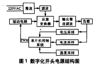 筆者設計的數字化開關電源額定功率12OW。xitongyikaiguandianyuanzuoweijibendianlu,caiyonggaoxingnengdanpianjizuoweikongzhixitong,zaikongzhisuanfadezhichixia,tongguoduishuchudianyahedianliujinxingshishicaiyang,bingyuruanjiangeidingzhixiangbijiao,kongzhihetiaozhengkaiguandianyuandegongzuozhuangtai,dedaoqiwangzhi。zhuyaobaokuoshurudezhengliulvboxiaozheng、功率變換、輔助電源部分、驅動電路、單片機控製係統5部分。功率變換部分采用單端反激變換電路,輔助電源為驅動電路提供電能,驅動電路將來自單片機的PWM 信號放大後驅動主功率晶體管,單片機係統是整個電路的控製核心,通過采樣值的變化實時控製輸出PWM 的占空比。整個設計力求做到了性能最優,成本最低。其結構如圖1所示。