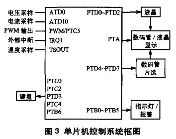 單片機采用Freescale公司的68HC908SR12,其內部資源豐富,集成了12k的程序存儲器,2路定時/計數器,14通道1o位A/D轉換器,PWM輸出,內部溫度傳感器等。單片機控製係統框圖如圖3。
