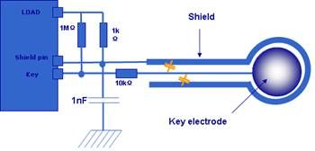 在STM8S的解決方案中,ST提供了感應電極和走線的設計規範和如圖3所示的Driven Shield功能(在Shield線上提供與按鍵管腳相同的驅動信號,電極與Shield之間的寄生電容就不會被充放電),能有效地減少感應電極走線的寄生電容對按鍵靈敏度的影響。