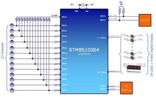電dian磁ci爐lu是shi采cai用yong磁ci場chang感gan應ying電dian流liu的de加jia熱re原yuan理li對dui食shi物wu進jin行xing加jia熱re。加jia熱re時shi,通tong過guo麵mian板ban下xia方fang的de線xian圈quan產chan生sheng強qiang磁ci場chang,磁ci力li線xian穿chuan過guo導dao磁ci體ti做zuo的de鍋guo的de底di部bu時shi,鍋guo具ju切qie割ge交jiao變bian磁ci力li線xian而er在zai鍋guo具ju底di部bu產chan生sheng渦wo流liu使shi鍋guo底di迅xun速su發fa熱re,達da到dao加jia熱re食shi物wu的de目mu的de。在zai本ben解jie決jue方fang案an中zhong采cai用yong44pin的STM8S105S4做按鍵顯示板的主控芯片,控製13個按鍵的掃描、24個LED及一個4位數碼管的顯示、I2C與主板的通訊,並留有一個SWIM接口方便工程師調試之用(如圖2)。