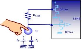 ST的電容式觸摸按鍵方案通過一個電阻和感應電極的電容CX構成的阻容網絡的充電/放電時間來檢測人體觸摸所帶來的電容變化。如圖1所示,當人手按下時相當於感應電極上並聯了一個電容CT,增加了感應電極上的電容,感應電極進行充放電的時間會增加,從而檢測到按鍵的狀態。而感應電極可以直接在PCB板上繪製成按鍵、滾輪或滑動條的應用樣式,也可以做成彈簧件插在PCB板上,即使隔著絕緣層(玻璃、樹脂)也不會對其檢測性能有所影響。