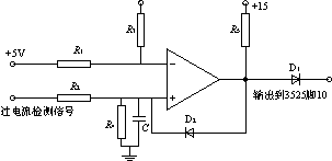 過電流保護采用電流互感器作為電流檢測元件,其具有足夠快的響應速度,能夠在IGBT允許的過流時間內將其關斷,起到保護作用。如圖1所示,過流保護信號取自CT2,經分壓、濾波後加至電壓比較器的同相輸入端,如圖4所示。當同相輸入端過電流檢測信號比反相輸入端參考電平高時,比較器輸出高電平,使D2從(cong)原(yuan)來(lai)的(de)反(fan)向(xiang)偏(pian)置(zhi)狀(zhuang)態(tai)轉(zhuan)變(bian)為(wei)正(zheng)向(xiang)導(dao)通(tong),並(bing)把(ba)同(tong)相(xiang)端(duan)電(dian)位(wei)提(ti)升(sheng)為(wei)高(gao)電(dian)平(ping),使(shi)電(dian)壓(ya)比(bi)較(jiao)器(qi)一(yi)直(zhi)穩(wen)定(ding)輸(shu)出(chu)高(gao)電(dian)平(ping)。同(tong)時(shi),該(gai)過(guo)電(dian)流(liu)信(xin)號(hao)還(hai)送(song)到(dao)SG3525的腳10。當SG3525的腳10為高電平時,其腳11及腳14上輸出的脈寬調製脈衝就會立即消失而成為零。