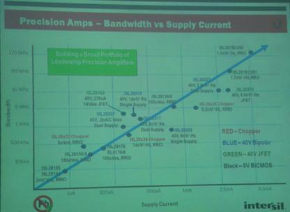 Intersil建立一個以精準放大器為主的大係列產品,從最初的ISL28194到ISL28190/290產品,頻帶寬度和電流都有很大提升。