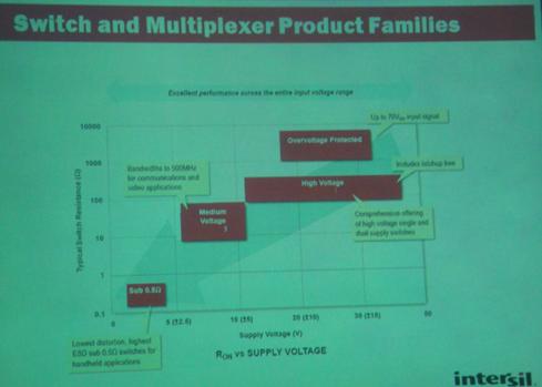 Roger還介紹了Intersil開關和多路複用器及接口產品線的情況,其sub 0.5Ω開關用於便攜應用,中壓產品用於通信和視頻應用,並且能提供高壓單/雙電源開關等。