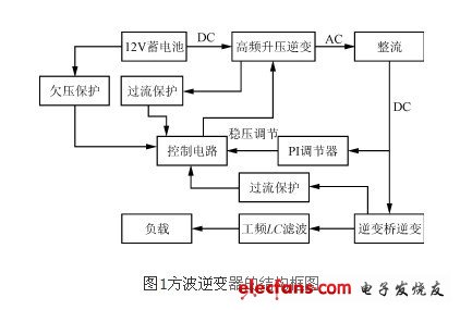 目前,構成DC/AC逆變的新技術很多,但是考慮到具體的使用條件和成本以及可靠性,本電源仍然采用典型的二級變換,即DC/DC變換和DC/AC逆變。首先由DC/DC變換將DC 12V電壓逆變為高頻方波,經高頻升壓變壓器升壓,再整流濾波得到一個穩定的約320V直流電壓;然後再由DC/AC變換以方波逆變的方式,將穩定的直流電壓逆變成有效值稍大於220V的方波電壓;再經LC工頻濾波得到有效值為220V的50Hz交流電壓,以驅動負載。