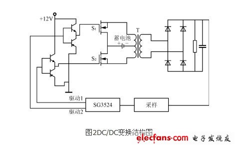 由於變壓器原邊電壓比較低,為了提高變壓器的利用率,降低成本,DC/DC變換如圖2所示,采用推挽式電路,原邊中心抽頭接蓄電池,兩端用開關管控製,交替工作,可以提高轉換效率。而推挽式電路用的開關器件少,雙端工作的變壓器的體積比較小,可提高占空比,增大輸出功率。