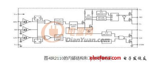 IR2110 的內部結構和工作原理框圖如圖4所示。圖中HIN和LIN為逆變橋中同一橋臂上下兩個功率MOS的驅動脈衝信號輸入端。SD為保護信號輸入端,當該腳接高電平時,IR2110的輸出信號全被封鎖,其對應的輸出端恒為低電平;而當該腳接低電平時,IR2110的輸出信號跟隨HIN和LIN而變化,在實際電路裏,該端接用戶的保護電路的輸出。HO和LO是兩路驅動信號輸出端,驅動同一橋臂的 MOSFET。