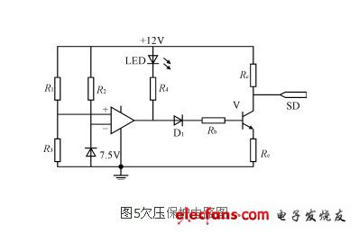 圖5中運算放大器的正向輸入端的電壓由R1和R3分壓得到,而反向輸入端的電壓由穩壓管箝位在+7.5V,當蓄電池的電壓下降超過預定值後,運算放大器開始工作,輸出跳轉為負,LED燈亮,同時三級管V截止,向SG3524的SD端輸出高電平,封鎖IR2110的輸出驅動信號。