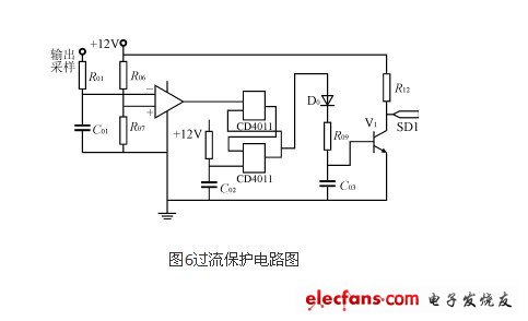 過流保護電路如圖6所示,它監測輸出電流狀況,預設為1.5A。方波逆變器的輸出電流經過采樣進入運算放大器的反向輸入端,當輸出電流大於1.5A後,運算放大器的輸出端跳轉為負,經過 CD4011組成的R-S觸發器後,使三級管V1基級的信號為低電平,三級管截止,向IR2011的SD1端輸出高電平,達到保護的目的。