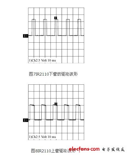 調試過程遇到的一個較為重要的問題是關於IR2110的自舉電容的選擇。IR2110的上管驅動是采用外部自舉電容上電,這就使得驅動電源的路數大大減少,但同時也對VB和VC之間的自舉電容的選擇也有一定的要求。經過試驗後,最終采用1μF的電解電容,可以有效地滿足自舉電壓的要求。
