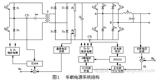 車載電源係統如圖1所示。12V直流電壓經過高頻逆變和高頻整流,得到一個符合要求的350V直流電壓,該部分的控製信號由TL494芯片產生。