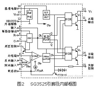 係統采用SG3525來實現SPWM控製信號的輸出,該芯片其引腳及內部框圖如圖2所示。