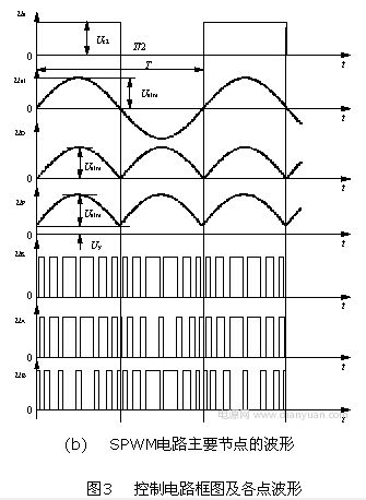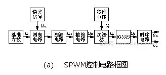 要得到正弦電壓的輸出,就要使逆變電路的控製信號以SPWM方式控製功率管的開關,所得到的脈衝方波輸出再經過濾波就可以得到正弦輸出電壓。通過SG3525來實現輸出正弦電壓,首先要得到SPWM的調製信號,而要得到SPWM調製信號,必須得有一個幅值在1~3.5V,按正弦規律變化的饅頭波,將它加到SG3525腳2,並與鋸齒波比較,就可得到正弦脈寬調製波實現SPWM的控製電路框圖如圖3(a)所示,實際電路各點的波形如圖3(b)所示。