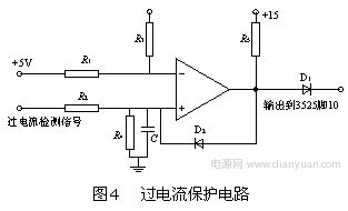過電流保護采用電流互感器作為電流檢測元件,其具有足夠快的響應速度,能夠在IGBT允許的過流時間內將其關斷,起到保護作用。如圖1所示,過流保護信號取自CT2,經分壓、濾波後加至電壓比較器的同相輸入端,如圖4所示。當同相輸入端過電流檢測信號比反相輸入端參考電平高時,比較器輸出高電平,使D2從(cong)原(yuan)來(lai)的(de)反(fan)向(xiang)偏(pian)置(zhi)狀(zhuang)態(tai)轉(zhuan)變(bian)為(wei)正(zheng)向(xiang)導(dao)通(tong),並(bing)把(ba)同(tong)相(xiang)端(duan)電(dian)位(wei)提(ti)升(sheng)為(wei)高(gao)電(dian)平(ping),使(shi)電(dian)壓(ya)比(bi)較(jiao)器(qi)一(yi)直(zhi)穩(wen)定(ding)輸(shu)出(chu)高(gao)電(dian)平(ping)。同(tong)時(shi),該(gai)過(guo)電(dian)流(liu)信(xin)號(hao)還(hai)送(song)到(dao)SG3525的腳10。當SG3525的腳10為高電平時,其腳11及腳14上輸出的脈寬調製脈衝就會立即消失而成為零。