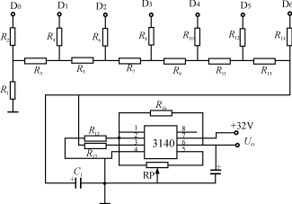 這需要將計數器的二進製數轉化為電壓。顯然用D/A轉換是可以的,但電路複雜程度上升,成本也有所提高。故為了簡化電路我們僅借用D/A轉換網絡的思想,利用權電阻T形網絡將4516的7位數值變換成模擬量輸出,推動電壓表指示,見圖5。