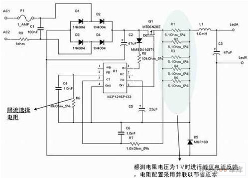 圖3:采用峰值電流控製的NCP1216非隔離型離線式LED驅動應用。