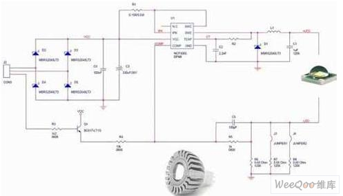 圖1:安森美半導體離線式第二代LED驅動器NCP1014/1028的應用示意圖。