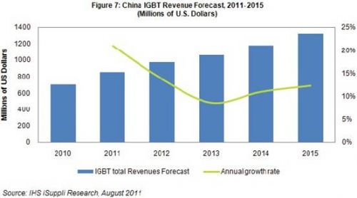 據IHS iSuppli公司中國研究服務即將發表的一份報告,由於綠色能源與能源效率得到更多的重視,以及政府投資支持和嚴格的能源政策,2011-2015年中國絕緣柵雙極型晶體管(IGBT)市場銷售額的複合年度增長率將達13%。
