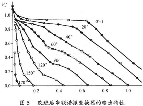 圖4中最大的功率曲線(α=1)即對應於變換器開環工作,圖4中停留在底部的曲線是對應於輕載的情況。工作在歸一化的輸出電流I*o=0.15%且ψ=1時,結果產生大約30%的過壓。改進變換器的輸出特性為雙斜率輸出特性,使電路提高了電壓、電流限製的固有能力,改善了高壓電源的空、滿載的適應性,同時有利於高壓電源寬範圍的輸出調節。
