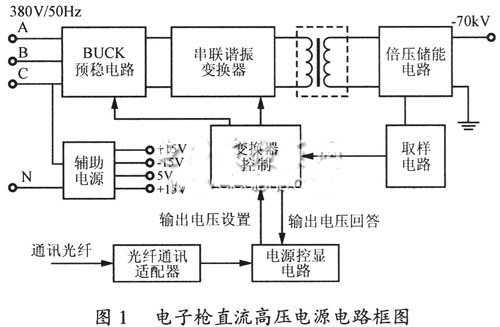 由於70kV直流高壓電源輸出要求穩定度和動態響應高,同時電源輸出高壓部分絕緣設備要求嚴格,為了減小電源的體積、減輕重量、降低損耗、提高效率,選用了高頻開關電源的設計方案。考慮到此高壓電源的負載是阻抗在MΩ~kΩ之(zhi)間(jian)變(bian)化(hua)的(de)電(dian)子(zi)槍(qiang)的(de)電(dian)子(zi)束(shu)流(liu),因(yin)此(ci)在(zai)束(shu)流(liu)引(yin)出(chu)時(shi),在(zai)電(dian)源(yuan)內(nei)阻(zu)一(yi)定(ding)的(de)情(qing)況(kuang)下(xia),為(wei)了(le)保(bao)證(zheng)電(dian)源(yuan)的(de)輸(shu)出(chu)電(dian)壓(ya)滿(man)足(zu)負(fu)載(zai)的(de)空(kong)滿(man)載(zai)變(bian)化(hua),保(bao)證(zheng)輸(shu)出(chu)電(dian)壓(ya)穩(wen)定(ding)度(du)的(de)較(jiao)高(gao)要(yao)求(qiu),在(zai)電(dian)源(yuan)的(de)設(she)計(ji)上(shang)采(cai)用(yong)了(le)兩(liang)級(ji)功(gong)率(lv)處(chu)理(li)電(dian)路(lu)。