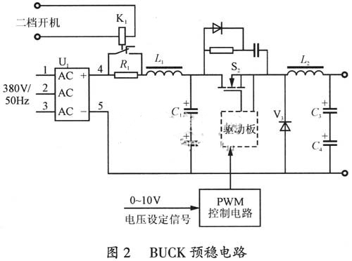 三相交流配電經整流濾波電路之後,形成500V左右的直流電壓加在。BUCK預穩電路的輸入端。其中K1為抑製合閘浪湧電壓而設置的,其二檔吸合信號由電源控顯電路給出。S2為BUCK功率開關管,其工作脈衝由PWM控製電路給出,為了保證電源具有足夠的動態特性,該功率開關管工作頻率為100kHz左右。PWM控製器輸出脈衝寬度,由電壓設定信號給出。當電壓設定信號由0~10V變換時,PWM控製器輸出的脈衝占空比在0~0.85的範圍內變化。L2為儲能電感,由於BUCK電路的占空比在0~0.85大(da)範(fan)圍(wei)變(bian)化(hua),為(wei)了(le)保(bao)證(zheng)電(dian)路(lu)起(qi)到(dao)預(yu)穩(wen)作(zuo)用(yong),需(xu)要(yao)避(bi)免(mian)輸(shu)出(chu)電(dian)流(liu)斷(duan)續(xu),同(tong)時(shi)不(bu)至(zhi)於(yu)設(she)計(ji)餘(yu)量(liang)過(guo)大(da),采(cai)用(yong)了(le)額(e)定(ding)負(fu)載(zai)條(tiao)件(jian)下(xia)的(de)計(ji)算(suan)值(zhi),實(shi)際(ji)工(gong)作(zuo)情(qing)況(kuang)良(liang)好(hao)。