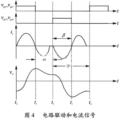 電路的諧振槽路的電流波形和驅動信號波形如圖4所示,通過調節α角控製變換器的輸出功率。