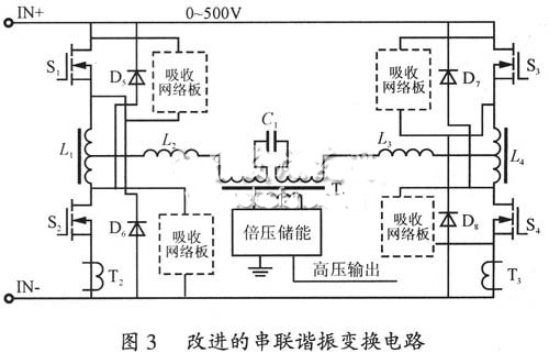 串聯諧振電路具有較好的抗短路特性,對待如真空電子管等由於真空度急劇下降而引起的“打火”故障的適應能力較強;其整流器輸出無需加濾波電感,可以降低高壓整流矽堆的耐壓要求;諧振功率變換器的最大優點是效率高、噪聲低。但在該電子槍高壓電源中,由於需要70kVzhigaodedianya,gaopinkaiguanbianyaqidebianbibidinghenda,bianyaqifubianraozudedengxiaodianrongyemingxianzengda。bianyaqidedengxiaodianrongdengfenbucanshujiangmingxianyingxiangbianhuanqigongzuo。rucaiyongchuantongdechuanlianxiezhenbianhuanqituopu,jiangshibianhuanqidewugonggonglvmingxianzengjia。dadewugonggonglvjianggeigonglvkaiguanguanhegaopinkaiguanbianyaqidailaidadedianliuyingli,yingxiangbianhuanqidekekaogongzuo。weici,kaolvdao70kV電子槍直流高壓電源的負載特性和工作狀態,采用了一種改進的串聯諧振變換器拓撲結構電路,降低了分布參數對變換器的影響。圖3給出了改進的串聯諧振變換器的電路圖。