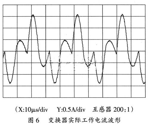 整個變換器電路依然采用PFM的工作模式,當前級預穩電源輸出0~500V直(zhi)流(liu)電(dian)壓(ya)時(shi),變(bian)換(huan)器(qi)以(yi)固(gu)定(ding)的(de)脈(mai)衝(chong)寬(kuan)度(du)驅(qu)動(dong)橋(qiao)臂(bi)的(de)功(gong)率(lv)開(kai)關(guan)管(guan)。為(wei)了(le)保(bao)證(zheng)電(dian)源(yuan)在(zai)電(dian)子(zi)槍(qiang)束(shu)流(liu)產(chan)生(sheng)時(shi)能(neng)穩(wen)定(ding)工(gong)作(zuo),設(she)計(ji)了(le)取(qu)樣(yang)閉(bi)環(huan)控(kong)製(zhi)功(gong)能(neng),當(dang)輸(shu)出(chu)偏(pian)離(li)電(dian)壓(ya)設(she)定(ding)值(zhi)時(shi),變(bian)換(huan)器(qi)通(tong)過(guo)脈(mai)衝(chong)頻(pin)率(lv)調(tiao)節(jie)得(de)到(dao)穩(wen)定(ding)的(de)輸(shu)出(chu),電(dian)子(zi)槍(qiang)高(gao)壓(ya)電(dian)源(yuan)實(shi)際(ji)工(gong)作(zuo)頻(pin)率(lv)為(wei)3~25kHz。改進後的串聯諧振變換器如圖5所示,變換器的實際工作電流波形如圖6所示。