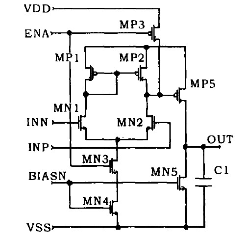 過放電檢測電路(VD2)可利用一個二級開環比較器來實現,如圖2所示。在設計中應采用差分輸入並盡可能地提高增益,以滿足精度要求。該電路中,第一級是由MN1,MN2,MP1,MP2,MN3,MN4組成的差分放大器。第二級是由MP5,MN5組zu成cheng的de單dan級ji放fang大da器qi。前qian級ji放fang大da器qi放fang大da輸shu入ru的de差cha模mo信xin號hao,後hou一yi級ji將jiang前qian級ji的de輸shu出chu進jin一yi步bu放fang大da,以yi達da到dao數shu字zi信xin號hao的de輸shu出chu電dian平ping。該gai比bi較jiao器qi電dian路lu的de直zhi流liu增zeng益yi為wei: