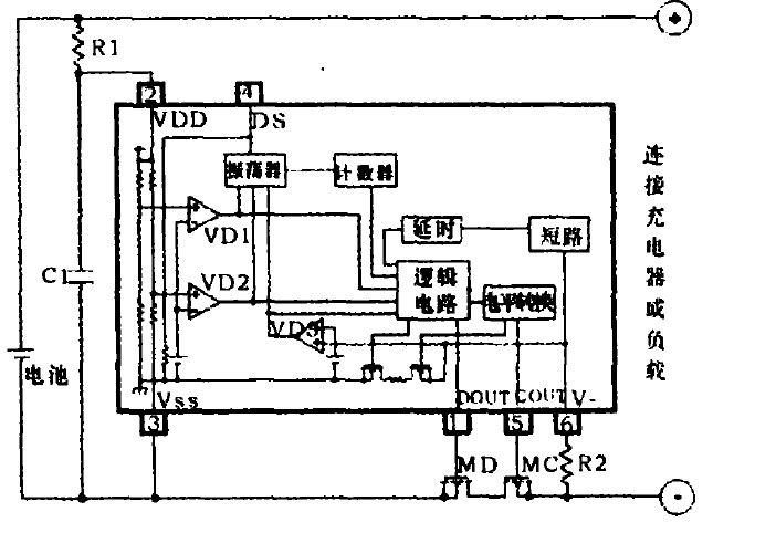 在放電時,若電池電壓低於過放電檢測電壓並保持相應的延遲時間,DOUT端由高電位變為低電位,放電控製MOS管MD關斷,芯片進入過放電保護模式,停止放電。