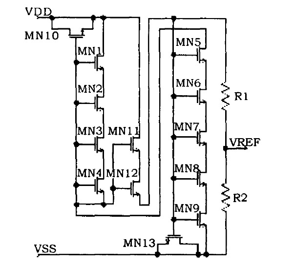 基於耗盡型NMOS管閾值電壓為負值,在VGS=0時也處於工作狀態,該特性可有效降低其工作電壓及功耗。因而,該基準電路中利用串聯的耗盡型NMOS管MN1-MN4、串聯的增強型NMOS管MN5-MN9、MN11-MN12和電阻R1、R2構成基於VGS的基準電壓電路,該基準電路的輸出為檢測比較器反相端的基準電壓信號VREF。