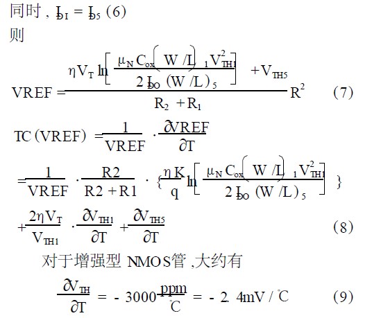 即對於增強型NMOS管,VTH隨溫度升高而下降,而對於耗盡型NMOS管,VTH為負值,其絕對值隨溫度升高而上升。由此推得,當選取合適的參數時,本電路的溫度漂移可以控製在較小範圍內。
