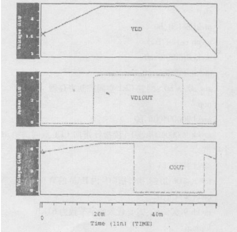 本芯片采用0.6μm的標準CMOS工藝。使用49級HSPICE模型進行仿真。圖4為過充電保護及複原波形圖,圖5為過放電保護及複原波形圖。