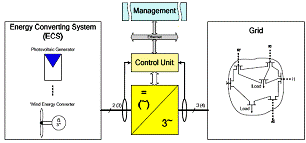 目前的許多研究致力於為電力係統最優化、負載分配、參數配置和電能儲存管理製定策略。由於最近對於“智能電網”和“虛擬電廠”的(de)展(zhan)望(wang),研(yan)究(jiu)的(de)關(guan)注(zhu)點(dian)的(de)選(xuan)擇(ze)通(tong)常(chang)依(yi)據(ju)經(jing)濟(ji)功(gong)效(xiao),受(shou)到(dao)市(shi)場(chang)的(de)推(tui)動(dong)。但(dan)是(shi),我(wo)們(men)不(bu)能(neng)忘(wang)記(ji),任(ren)何(he)高(gao)級(ji)的(de)電(dian)力(li)係(xi)統(tong)運(yun)行(xing)技(ji)術(shu)必(bi)須(xu)以(yi)物(wu)理(li)上(shang)穩(wen)定(ding)和(he)可(ke)靠(kao)運(yun)行(xing)的(de)電(dian)力(li)係(xi)統(tong)為(wei)基(ji)礎(chu)。為(wei)了(le)滿(man)足(zu)這(zhe)種(zhong)新(xin)型(xing)電(dian)力(li)係(xi)統(tong)的(de)要(yao)求(qiu),對(dui)電(dian)網(wang)的(de)物(wu)理(li)層(ceng)麵(mian)的(de)控(kong)製(zhi)必(bi)須(xu)重(zhong)新(xin)調(tiao)整(zheng)加(jia)以(yi)改(gai)進(jin)。與(yu)此(ci)同(tong)時(shi),分(fen)布(bu)式(shi)電(dian)源(yuan)技(ji)術(shu)和(he)高(gao)滲(shen)透(tou)性(xing)的(de)可(ke)再(zai)生(sheng)電(dian)源(yuan)技(ji)術(shu)的(de)持(chi)續(xu)發(fa)展(zhan)趨(qu)勢(shi)也(ye)要(yao)求(qiu)電(dian)網(wang)控(kong)製(zhi)結(jie)構(gou)體(ti)係(xi)進(jin)行(xing)調(tiao)整(zheng)。現(xian)代(dai)電(dian)力(li)電(dian)子(zi)技(ji)術(shu),通(tong)過(guo)提(ti)供(gong)一(yi)個(ge)高(gao)效(xiao)的(de)自(zi)動(dong)控(kong)製(zhi)平(ping)台(tai)可(ke)以(yi)為(wei)DERs和RESs構建一個強大的電網連接,如圖1所示。等價於常規電源,電網連接逆變器可以表現為基本的電網連接功能。隻有當DERs和RESs可以從常規的大型集中式電源那裏接管過物理調控任務時,它們才能在電力係統中獲得與常規電源平等的地位。隻有當DERs和RESs在zai電dian力li接jie入ru電dian網wang的de過guo程cheng中zhong不bu止zhi享xiang受shou權quan利li,同tong時shi也ye能neng承cheng擔dan義yi務wu的de時shi候hou,它ta們men才cai能neng得de到dao真zhen正zheng的de自zi由you。為wei了le使shi逆ni變bian器qi能neng夠gou參can與yu到dao活huo躍yue的de電dian網wang控kong製zhi中zhong,充chong分fen的de控kong製zhi策ce略lve是shi必bi需xu的de。然ran而er,時shi至zhi今jin日ri,控kong製zhi理li念nian的de發fa展zhan還hai是shi遠yuan遠yuan落luo後hou於yu需xu要yao。