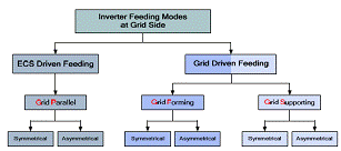 在ECS驅動饋電時,ECS決定了向電網傳輸的功率。如今,單台RESs逆變器典型地就在這種饋電方式下運行,並向電網注入全部可提供的功率。在電網驅動饋電時,不再是ECS,而是電網決定功率的傳輸。典型的,大多數常規大型電廠運行在這種方式下,同樣,這種方式潛在的適合DERs和RESs係統,或者至少適合混合式電力係統。在ECS驅qu動dong饋kui電dian的de情qing況kuang下xia,逆ni變bian器qi控kong製zhi方fang式shi被bei稱cheng作zuo電dian網wang平ping行xing方fang式shi。第di二er種zhong情qing況kuang可ke以yi被bei兩liang種zhong不bu同tong的de逆ni變bian器qi控kong製zhi方fang式shi實shi現xian,分fen別bie是shi電dian網wang形xing成cheng方fang式shi和he電dian網wang支zhi持chi方fang式shi。電dian網wang形xing成cheng方fang式shi中zhong逆ni變bian器qi的de作zuo用yong是shi建jian立li和he維wei持chi電dian網wang狀zhuang態tai變bian量liang。電dian網wang支zhi持chi方fang式shi中zhong逆ni變bian器qi被bei用yong於yu平ping衡heng功gong率lv。它ta可ke以yi傳chuan輸shu預yu先xian設she定ding數shu量liang的de功gong率lv,這zhe個ge數shu量liang可ke以yi根gen據ju電dian力li係xi統tong的de需xu要yao或huo者zhe高gao級ji控kong製zhi運yun行xing得de到dao的de參can考kao值zhi進jin行xing調tiao整zheng。應ying用yong這zhe個ge控kong製zhi方fang式shi的de逆ni變bian器qi例li子zi如ru圖tu3至圖5的左側所示。此外,這些基本有功功率調控器潛在的對二次電網控製的相互聯係可以被類似的闡釋。