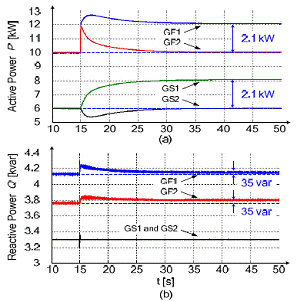 一yi段duan時shi間jian後hou,二er次ci控kong製zhi器qi控kong製zhi逆ni變bian器qi動dong作zuo,第di一yi個ge電dian網wang上shang的de階jie躍yue負fu載zai隻zhi由you第di一yi個ge電dian網wang上shang的de逆ni變bian器qi補bu償chang。交jiao換huan功gong率lv受shou到dao控kong製zhi重zhong新xin回hui到dao之zhi前qian的de設she定ding值zhi。不bu同tong逆ni變bian器qi的de無wu功gong功gong率lv如ru圖tu7b所示。開始時,所有逆變器提供的無功功率都近似為14.6kvar。15s的時候,第一個電網的無功功率增加了70var。zhengruqianmiantidaode,bencifangzhenbingmeiyouduiwugonggonglvjinxingercikongzhi。dianwangxingchengfangshidenibianqibuchangzengjiadejieyuefuzai,dianwangzhichifangshidenibianqitigongxiangtongshuliangdewugonggonglv。