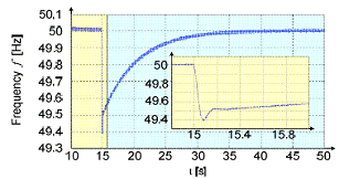 電力係統的頻率如圖8所示。由於一次和二次控製都影響電網頻率,但是影響是在不同的時間尺度,快速控製器的反應如放大窗口所示。