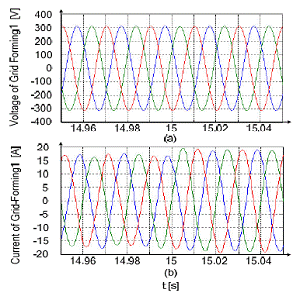 第一個電網形成方式的逆變器在連接點處的電壓和電流如圖9所示。逆變器電壓幾乎不受幹擾,與此同時,隻有電流去適應相關負載情況。