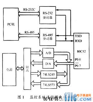 為了組建開關電源監控係統,係統中的每台電源配置了一個獨立的監控係統通信模塊。監控係統通信模塊采用的控製芯片是MCS51係列單片機80C52。80C52具有8k的內部ROM和256字節的內部RAM。監控係統通信模塊電路結構圖如圖1所示。計算機通過該通信模塊可以實時讀取電源的輸出電壓、輸出電流值以及輸出過壓、輸入過壓、輸入欠壓、過流、過熱、運行/停止等8路開關量的狀態值,並可以在輸出值允許的範圍內任意設置電源的輸出電壓、輸出電流值和複位、合閘、分閘、機控/本控4路開關量的狀態值。從監控係統通信模塊電路結構示意圖可以看出,如果計算機需要讀取電源模塊的輸出電壓、輸出電流值和開關量的狀態時,單片機收到請求命令後啟動A/D轉換芯片MAX182對電源的輸出電壓、輸出電流兩路模擬量進行轉換,轉換後的數據送入單片機進行數據處理。同時表征電源運行狀態的8路開關量從雙總線收發器74LS245讀入送至單片機寄存器存貯。單片機將所有處理後的數據按預定數據傳送格式發送給計算機輸出顯示。計算機需要設置電源的輸出電壓、輸出電流值和4路開關量的狀態時,計算機將設置好的數據按預定格式發送給單片機。單片機接收處理後啟動D/A轉換芯片MAX532和輸出鎖存器74LS573將處理後的輸出電壓、輸shu出chu電dian流liu值zhi和he開kai關guan量liang狀zhuang態tai值zhi輸shu出chu給gei電dian源yuan。監jian控kong係xi統tong通tong信xin模mo塊kuai從cong而er實shi現xian了le計ji算suan機ji對dui電dian源yuan的de實shi時shi監jian控kong。為wei了le保bao證zheng設she計ji人ren員yuan的de安an全quan和he防fang止zhi通tong信xin模mo塊kuai受shou電dian源yuan影ying響xiang而er損sun壞huai,電dian源yuan與yu通tong信xin模mo塊kuai之zhi間jian的de信xin號hao傳chuan遞di均jun通tong過guo光guang耦ou隔ge離li。