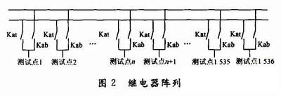 繼電器陣列由3168個繼電器實現了1536個測試點之間的導通/絕緣測試和繼電器組之間的隔離。1 536個測試點分布在12塊單板上麵,每塊單板上麵有128個測試點,單板內又分為16行,每行8列,即12×16×8=1 536。每一個測試點由兩個繼電器控製,分別是輸入繼電器(Kat)和輸出繼電器(Kab)。每塊單板對應外部的一個128芯的航空插頭,負責和被測產品的連接。其原理如圖2所示。