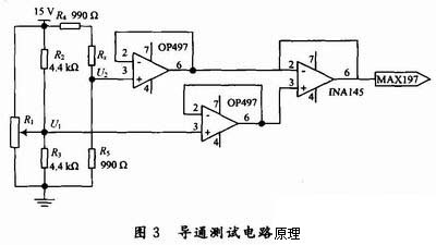 在圖3中:R1,R2和R3組成基準電路;R4,R5和Rx串聯起來組成主測試回路。當待測電阻Rx為零時,調整R1使電橋處於平衡狀態,即U1=U2,電路輸出約為零,同時產生基準比較電壓U1。在電路正常工作情況下,Rx串聯進入電路後,電橋的平衡被打破,U2變小,U1和U2經過運放OP497的隔離後送入差分放大器INA145進行放大,放大後的電壓信號送入12位精度的MAX197進行采樣。