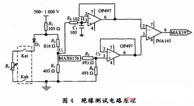 在圖4中:Rx為被測兩根導線間的絕緣電阻;Kat,Kab分別是Rx的輸入控製繼電器和輸出控製繼電器,由譯碼電路選通,二極管D1保護電源;R1,R2和R3組成分壓測試電路,R4為限流電阻,C1為了濾除雜波的幹擾,測試回路的分壓值經運放後輸入放大電路;MAX6176為高精度低噪聲基準電源,經過分壓電路和跟隨器後為放大電路INA145提供基準比較電壓,INA145把放大後的信號送給MAX197進行采樣。