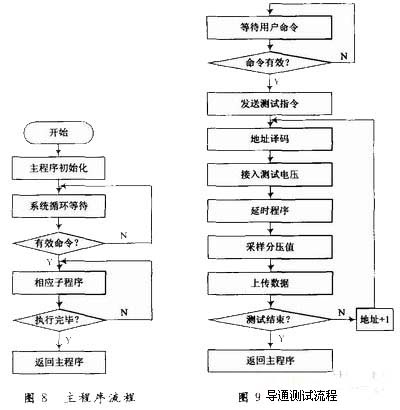 下麵以導通電阻測試為例來說明電纜測試係統的工作流程:當(dang)被(bei)測(ce)產(chan)品(pin)通(tong)過(guo)轉(zhuan)接(jie)電(dian)纜(lan)接(jie)入(ru)電(dian)纜(lan)測(ce)試(shi)係(xi)統(tong)後(hou),操(cao)作(zuo)者(zhe)通(tong)過(guo)參(can)數(shu)設(she)定(ding)來(lai)選(xuan)擇(ze)被(bei)測(ce)產(chan)品(pin)的(de)型(xing)號(hao)。當(dang)單(dan)片(pian)機(ji)接(jie)收(shou)到(dao)全(quan)部(bu)導(dao)通(tong)測(ce)試(shi)的(de)命(ming)令(ling),首(shou)先(xian)閉(bi)合(he)測(ce)試(shi)點(dian)1的輸入繼電器,其次依次閉合第2個測試點的輸出繼電器,第3個測試點的輸出繼電器到第m個測試點的輸出繼電器(m∈[2,1 536]);當閉合測試點n的輸入繼電器(n∈[2,1 535])後,依次閉合測試點m的輸出繼電器(m∈[n+1,1 536])。每(mei)閉(bi)合(he)一(yi)次(ci)輸(shu)出(chu)繼(ji)電(dian)器(qi),采(cai)樣(yang)一(yi)次(ci)輸(shu)出(chu)電(dian)壓(ya)值(zhi),並(bing)上(shang)傳(chuan)給(gei)工(gong)控(kong)機(ji)。工(gong)控(kong)機(ji)上(shang)的(de)數(shu)據(ju)處(chu)理(li)部(bu)分(fen)將(jiang)這(zhe)個(ge)電(dian)壓(ya)值(zhi)和(he)對(dui)應(ying)的(de)地(di)址(zhi)信(xin)息(xi)生(sheng)成(cheng)數(shu)據(ju)庫(ku),在(zai)測(ce)試(shi)結(jie)束(shu)時(shi),工(gong)控(kong)機(ji)將(jiang)生(sheng)成(cheng)的(de)數(shu)據(ju)庫(ku)與(yu)標(biao)準(zhun)的(de)數(shu)據(ju)庫(ku)進(jin)行(xing)比(bi)對(dui),從(cong)而(er)確(que)定(ding)出(chu)被(bei)測(ce)產(chan)品(pin)中(zhong)那(na)些(xie)通(tong)道(dao)是(shi)導(dao)通(tong)的(de)。導(dao)通(tong)測(ce)試(shi)部(bu)分(fen)的(de)工(gong)作(zuo)流(liu)程(cheng)如(ru)圖(tu)9所示。